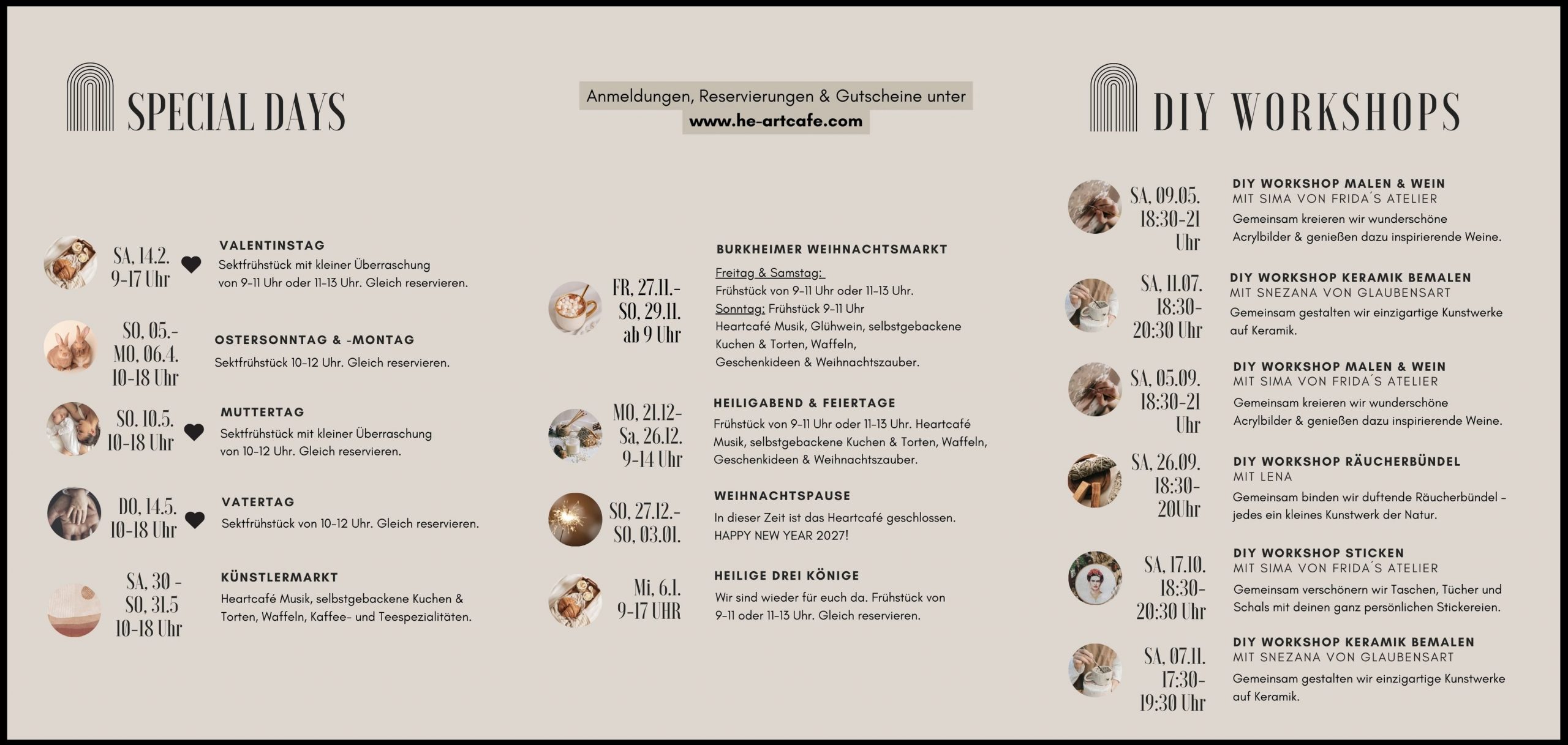 Im Jahr 2026 bieten wir im Heartcafé eine Vielzahl inspirierender Workshops an. Entdecke kreative DIY-Workshops wie Keramik bemalen oder Malen und Wein und lasse deiner Fantasie freien Lauf.